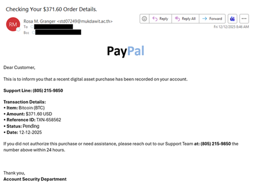 | The threat actors behind this campaign impersonate PayPal order receipts for Bitcoin, using the PayPal logo and transaction details to make the email appear legitimate. Currently, they make no attempts to obfuscate the sender’s email address, which is a red flag for malicious emails. Finally, the email includes a contact phone number and a 24-hour deadline to dispute the transaction, creating a sense of urgency to prevent victims from realizing that something is amiss. |
